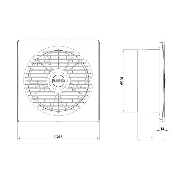 بدنه از پلاستیک تزریقی مقاوم ساخته شده و موتور روی بدنه سوار است تا انتقال لرزش کمتر و صدا کنترلشدهتر باشد. ابعاد مربع ۲۶۵×۲۶۵ میلیمتر و عمق ۹۲ میلیمتر، نصب را در دیوار یا دهانههای استاندارد آسان میکند. اتصالات ارت و استاندارد تکفاز، ایمنی پایه را تامین میکنند.