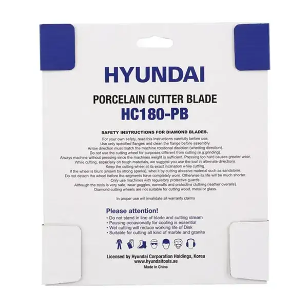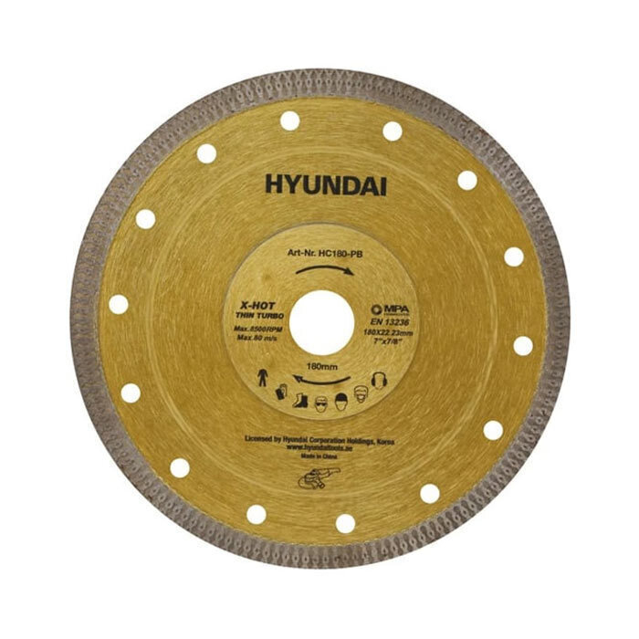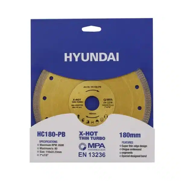 صفحه پرسلان بر ایکس توربو فلنجدار هیوندای مدل HC180-PB سایز 180 میلیمتر و ضخامت 2 میلیمتر، ابزاری مخصوص برای برش سریع و دقیق پرسلان، چینی، سرامیک و کاشی است. این محصول با لبه فوق نازک سری Thin Turbo و سگمنت الماسه یکپارچه تولید شده و مقاومت بالایی در برابر خمش و کار مداوم دارد.
