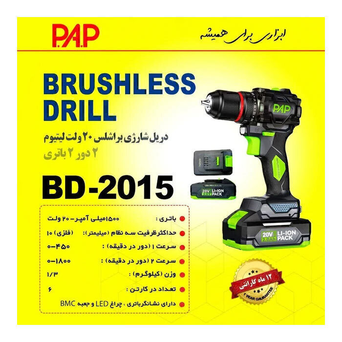 دریل شارژی پی ای پی مدل BD-2015 از دریلهای نسل جدید موتورهای براشلس ( بدون ذغال ) بوده که این امر سبب افزایش طول عمر ، بهبود کارایی و ایجاد صدای کمتر به هنگام کار دستگاه شده است و با طراحی منحصر به فرد و خاص خود، توجه تعدادی زیادی از خریداران را به خود جلب کرده است. این محصول با ساختار ارگونومیک و استانداردی که دارد از خستگی زودهنگام جلوگیری کرده و سبب طولانیتر شدن مدت زمان عملکرد میشود. دسته دریل شارژی فوق نیز با روکش ضد تعریق و ضد لغزش TPR تولید شده است.