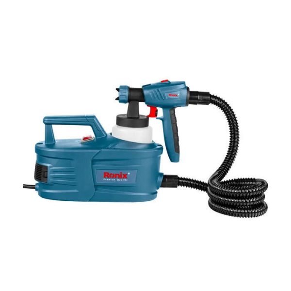 پیستوله خرطومی برقی رونیکس مجهز به موتوری 950 واتی و مخزنی با ظرفیت 800 میلیلیتر است. به علاوه این محصول دارای طراحی ارگونومیک در قسمت تفنگی جهت سهولت در کارایی و اثربخشی عملکرد در طولانی مدت میباشد. حداکثر جریان خروجی این پیستوله برقی 800 میلیلیتر در دقیقه و وزن آن 3.2 کیلوگرم است. این محصول جهت سهولت کاربری به سیستم تعویض آسان فیلتر هوا مجهز شده است.