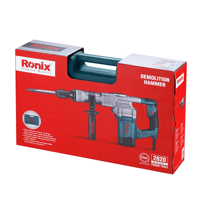 چکش تخریب 6 کیلویی رونیکس مدل 2820 دارای گیربکس صنعتی آلومینیومی و محفظه ریخته‌گری مقاوم است که در برابر ضربه و حرارت دوام بالایی دارد. دسته گردان 360 درجه باعث می‌شود بتوان در زوایای مختلف بدون خستگی از ابزار استفاده کرد. مکانیزم جلوگیری از نشت روغن عمر دستگاه را افزایش داده و عملکردی مطمئن ایجاد می‌کند. همراه داشتن دو عدد قلم تخریب و کیف مقاوم BMC نیز استفاده و جابه‌جایی این ابزار حرفه‌ای را ساده‌تر کرده است.