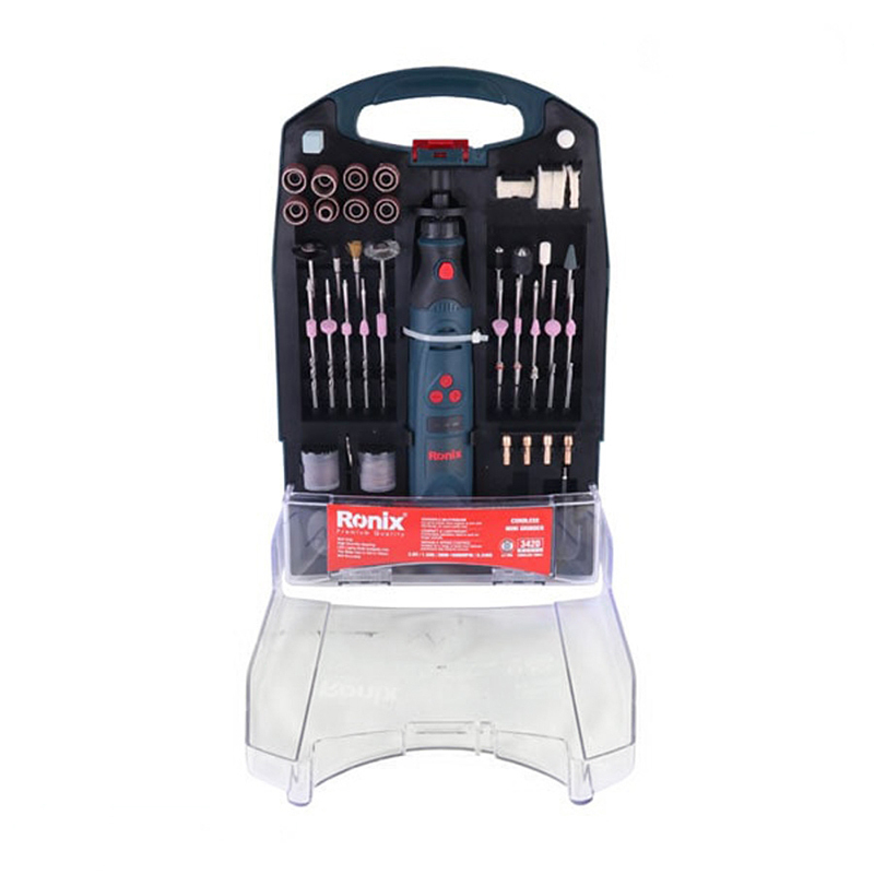 این ابزار با سرعت متغیر از 5000 تا 18000 دور در دقیقه، توانایی انجام کارهای زیادی را دارد. این دستگاه به باتری لیتیوم 1.5 آمپر با قابلیت شارژ سریع در 3 تا 5 ساعت مجهز است که امکان کار مداوم را به کاربر میدهد. کیت فرز مینیاتوری شارژی رونیکس مدل RH-3420 همراه با 118 قطعه متعلقات عرضه میشود که نیاز کاربران در برش، صیقلکاری و کارهای هنری یا تعمیراتی را پوشش میدهد. هرچند این دستگاه برای پروژههای بسیار سنگین صنعتی محدودیت دارد، اما برای مصارف خانگی، کارگاههای کوچک و کارهای دقیق گزینهای بسیار کاربردی و مقرونبهصرفه است.