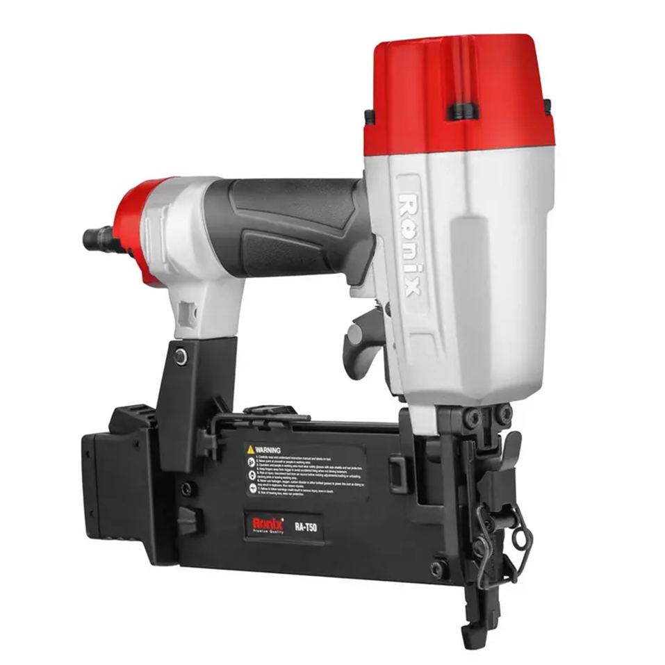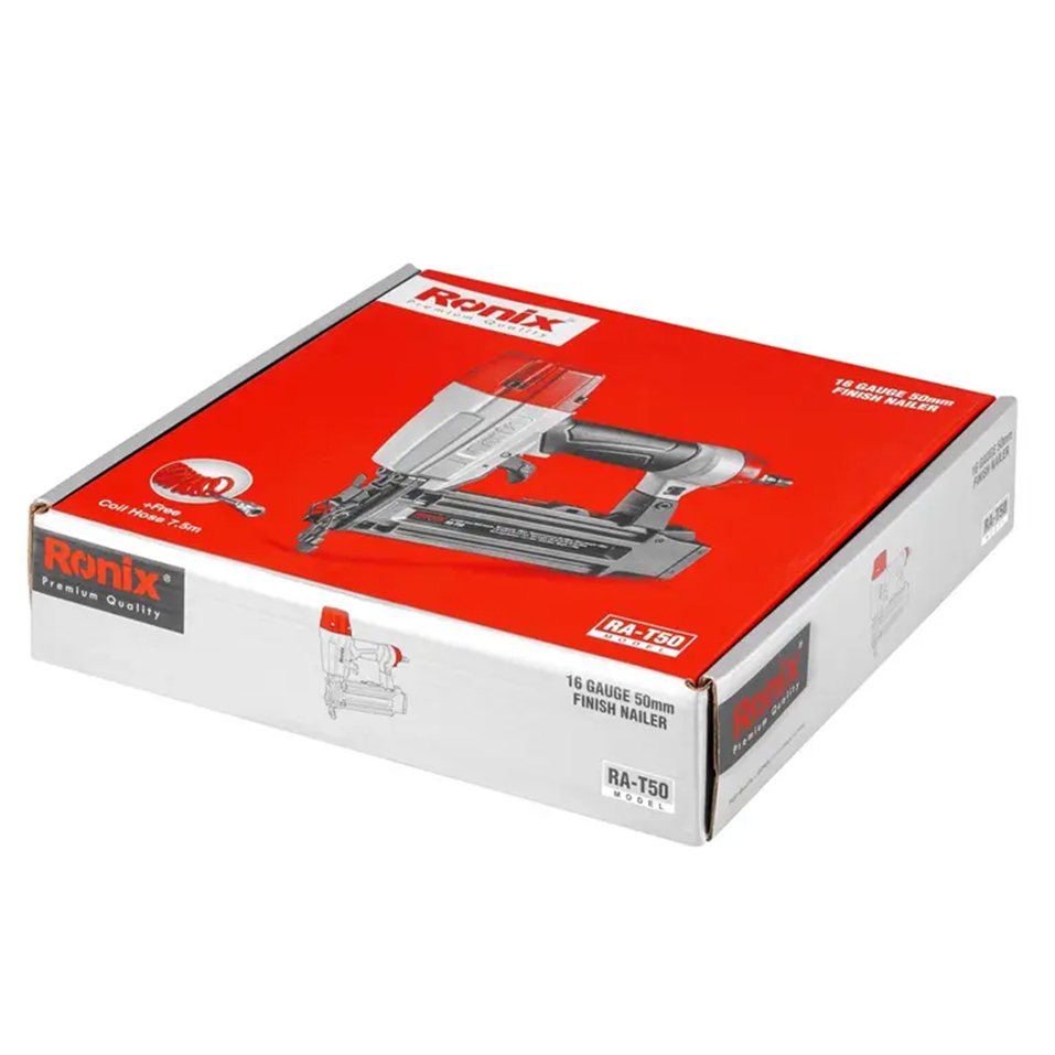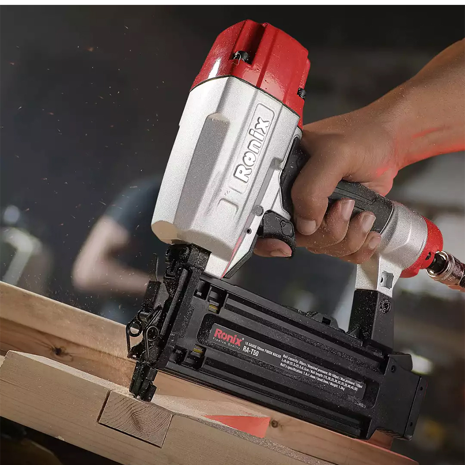 در ساخت میخکوب بادی رونیکس مدل T50 از آلومینیوم دایکاست مقاوم استفاده شده که استحکام بالا و وزن مناسبی برای حمل و کنترل آسان فراهم می‌کند. ضربه‌گیر لاستیکی و پوشش محافظ TPU در انتهای خشاب از آسیب به دستگاه و سطوح جلوگیری می‌کنند. این ابزار با فشار کاری 60 تا 100 psi و ظرفیت خشاب 80 عددی دارای عملکردی سریع و روان است. وجود قلاب کمری، شلنگ فنری و دفترچه راهنما نیز استفاده از آن را در محیط‌های کاری ساده‌تر و ایمن‌تر کرده است.
